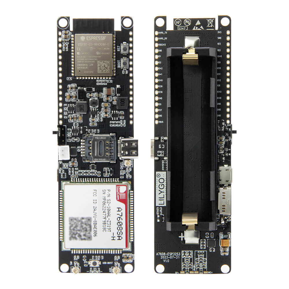 The ESP32-S3 handles local processing, WiFi connectivity, and Bluetooth 5, while the A7608 manages all cellular and positioning functions via AT commands over UART. Sample reference code is available in the LilyGO-T-A76XX GitHub repository.