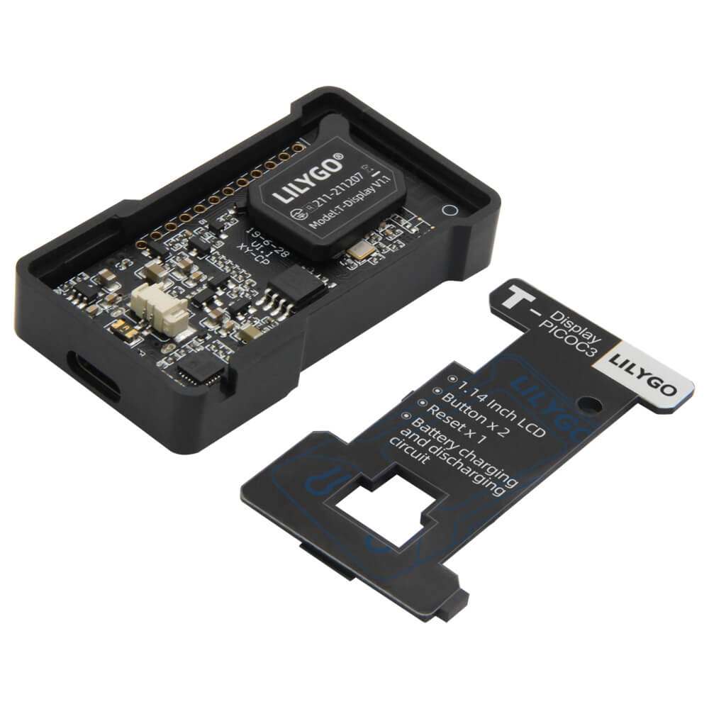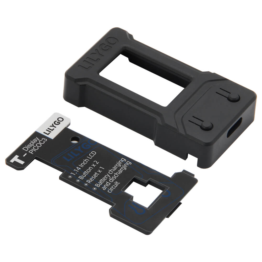 The LILYGO T-Display Case is a protective enclosure made from black ABS plastic, purpose-built to fit the LILYGO T-Display (1.14-inch LCD ESP32 control board) and the T-PicoC3 (ESP32-C3/RP2040 variant). The case snaps securely around the board while maintaining full access to the buttons and GPIO pin connections.
