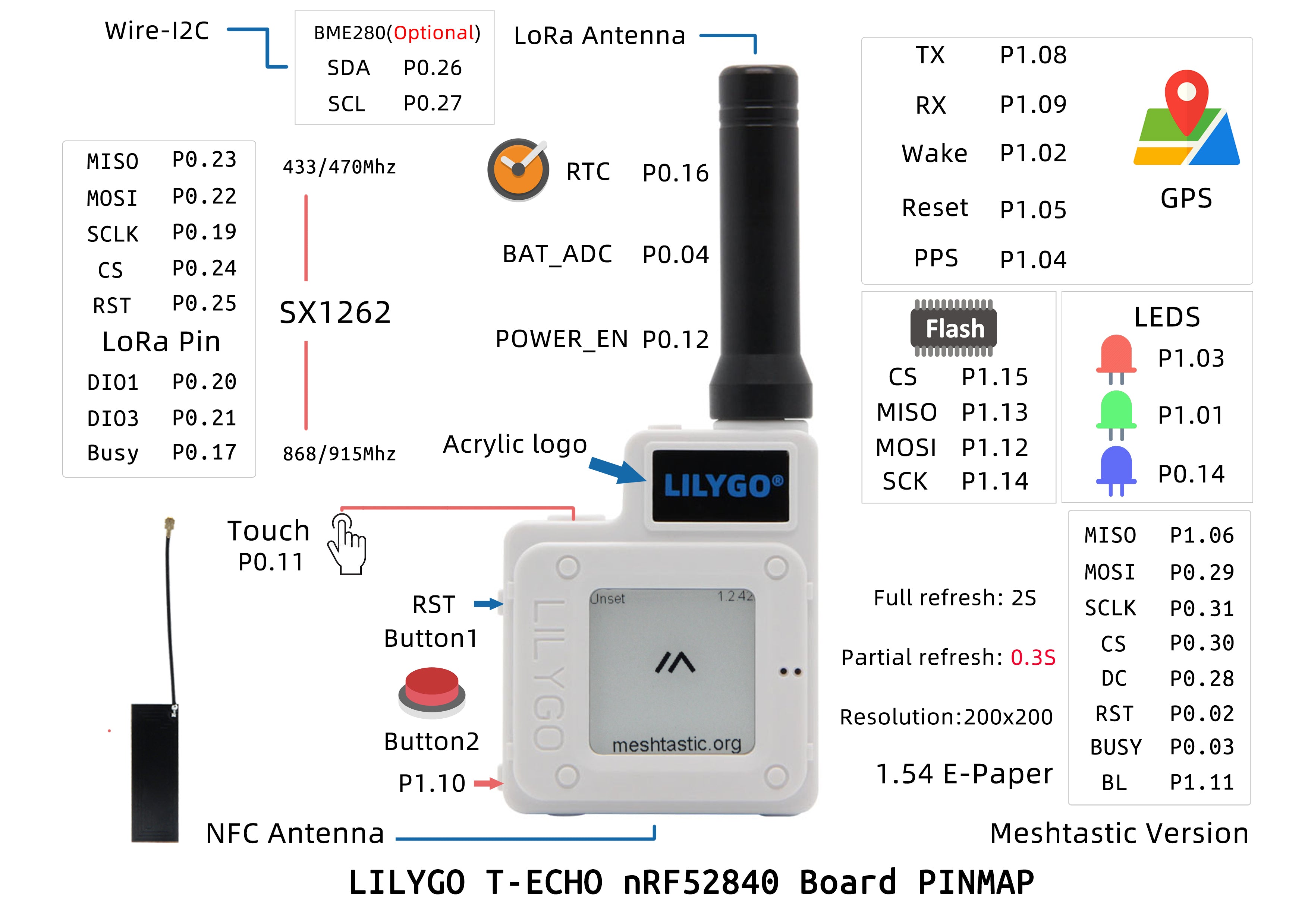 Nordic nRF52840 development board with SX1262 LoRa, L76K GPS, e-ink display, and optional BME280 sensor for Meshtastic, SoftRF, and low-power GPS tracker applications.