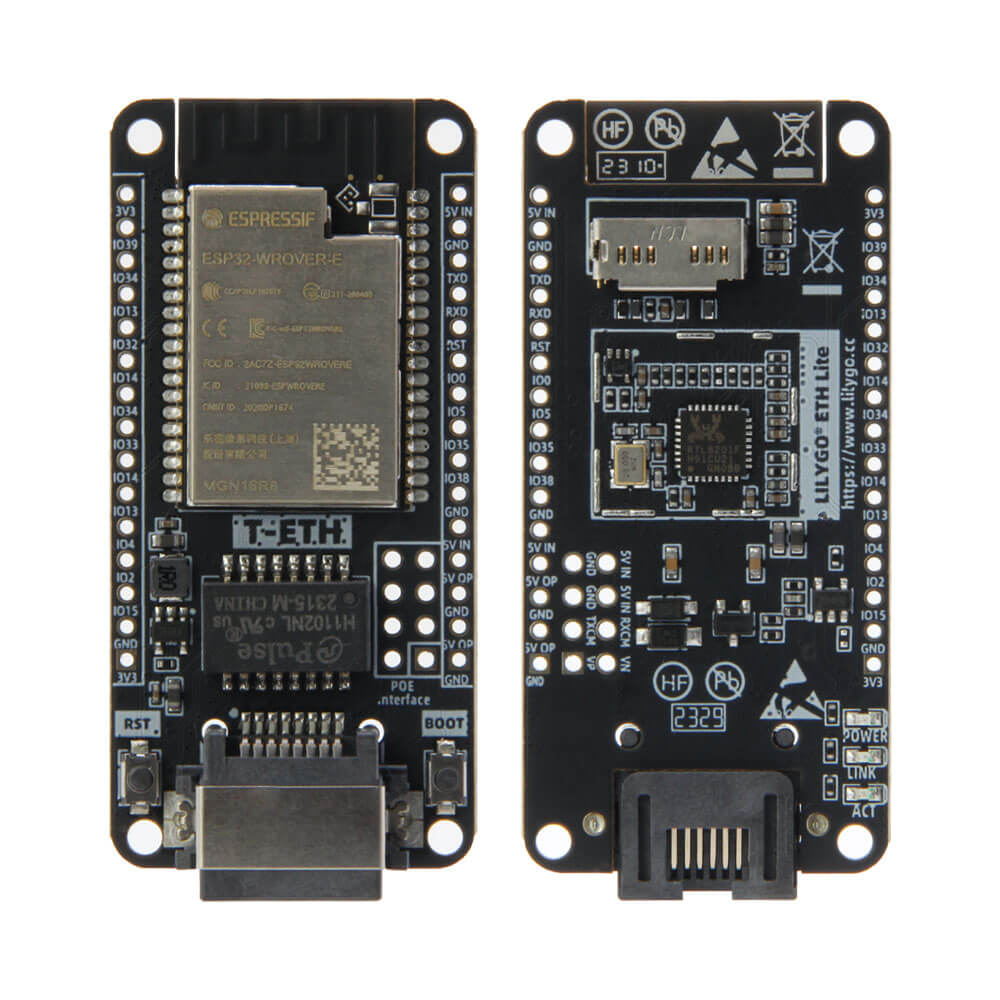 The LILYGO T-ETH Lite is a compact and affordable Ethernet-enabled development board available in two MCU variants. The ESP32 version uses an ESP32-WOVER-E module with an RTL8201 Ethernet controller, while the ESP32-S3 version uses an ESP32-S3-WROOM-1 module with a W5500 Ethernet controller. Both variants include 16MB flash and 8MB PSRAM.