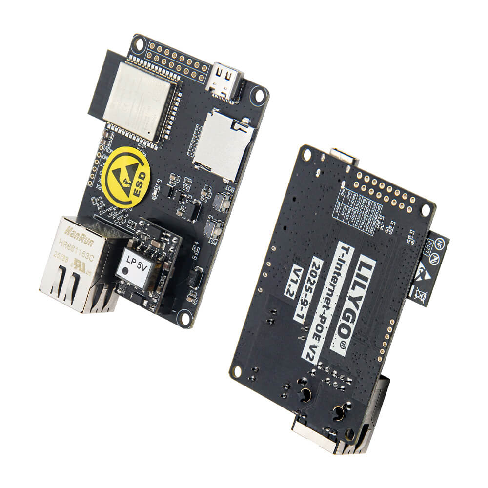 The LILYGO T-Internet-POE V2 is an ESP32 development board that adds wired Ethernet connectivity via the LAN8720 PHY transceiver and Power-over-Ethernet (PoE) capability, allowing both power delivery and data over a single Ethernet cable. This makes it ideal for fixed installation IoT nodes where running a separate power cable is impractical.