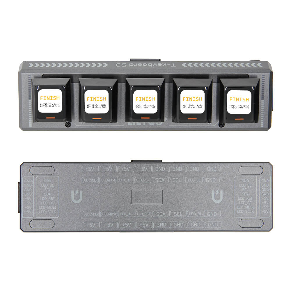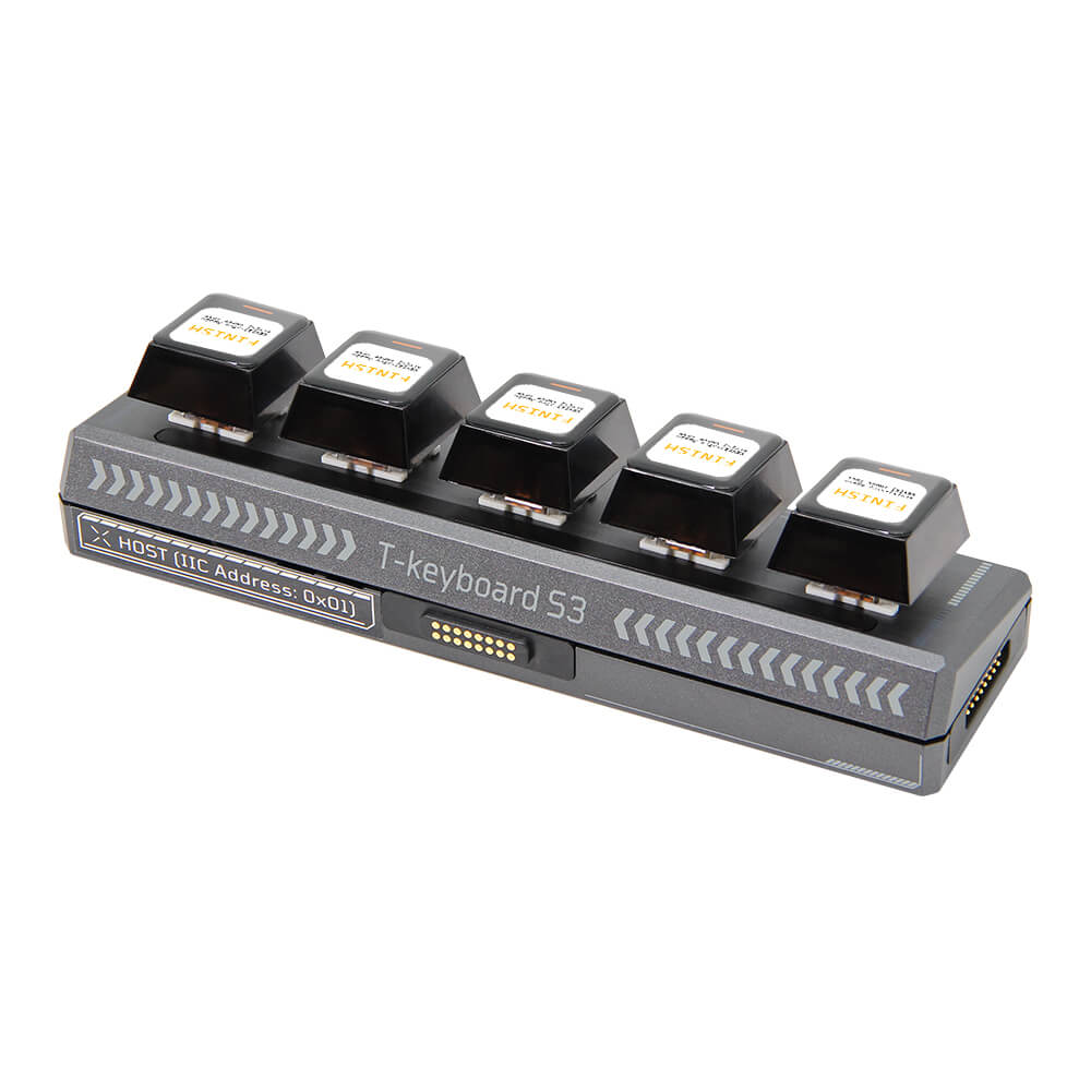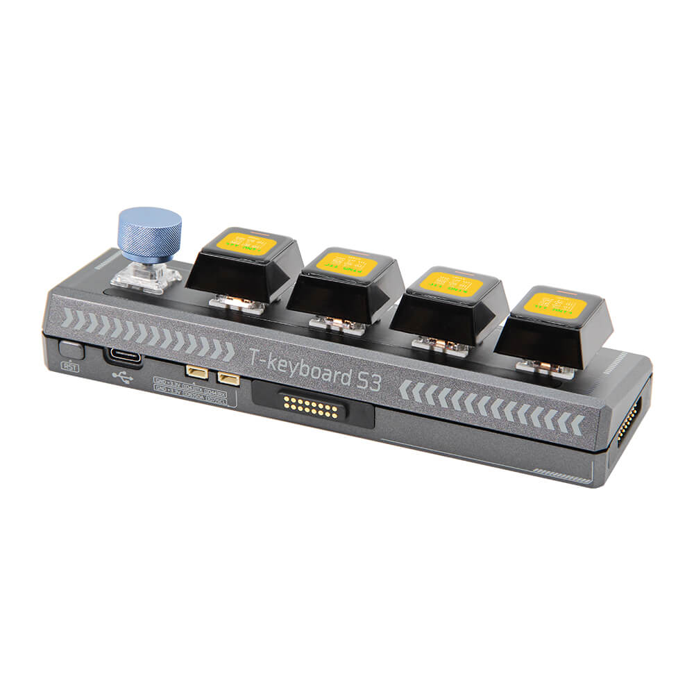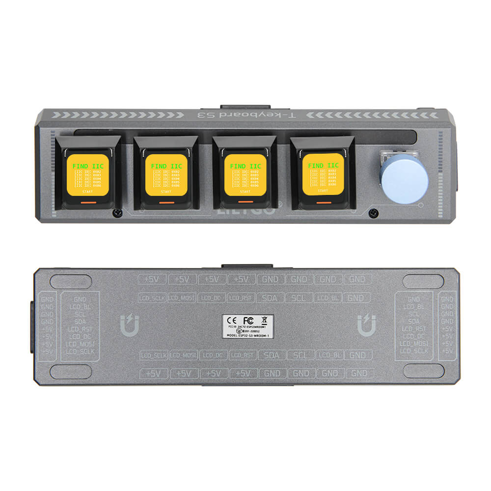 The LILYGO T-Keyboard S3 Pro is an innovative programmable macro pad featuring dual microcontrollers — an ESP32-S3R8 as the primary processor and an STM32G030F6P6 for keyboard matrix scanning. Each of the four key positions has its own 0.85-inch TFT LCD (128×128 pixels via GC9107) for displaying custom icons, labels, or real-time information, and 14 WS2812 RGB LEDs provide per-key backlighting.