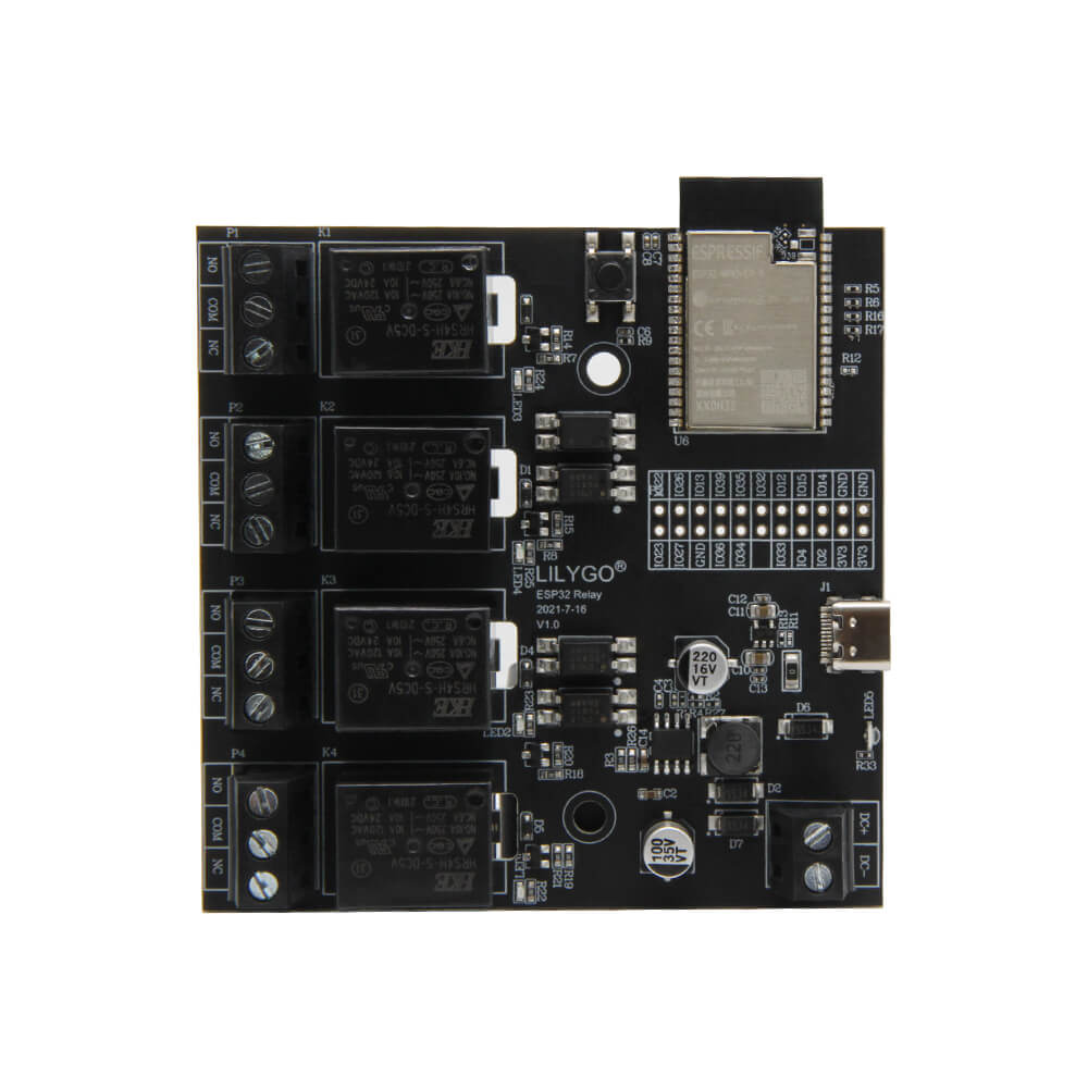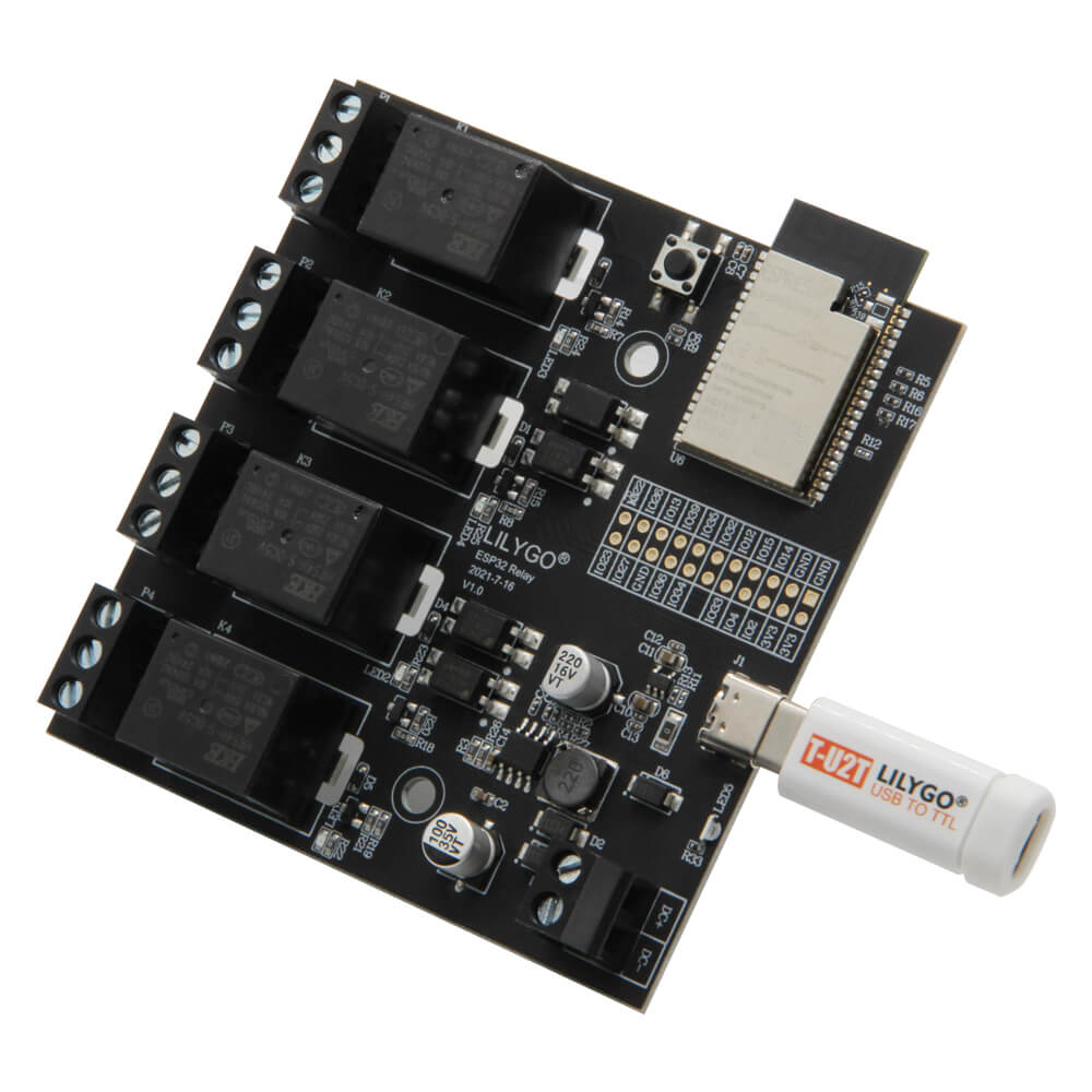 The LILYGO T-Relay is a compact ESP32 development board with four integrated relay outputs, making it an all-in-one solution for wireless relay control applications. Each relay is driven by an optocoupler for electrical isolation, protecting the ESP32 from voltage spikes on the relay side. Blue LED indicators on each relay provide clear visual feedback of the current switching state.