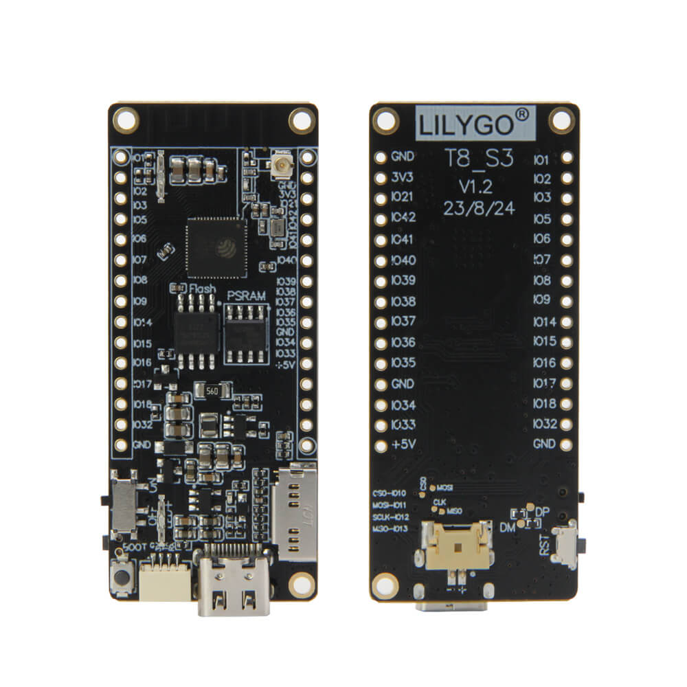 Note that the T8-C3 requires the T-U2T USB-to-serial adapter for programming, as it does not include an integrated USB-to-serial chip. The T8-S3 variant includes USB connectivity directly. The board supports development in Arduino, ESP-IDF, and MicroPython, and is programmed using C/C++ or MicroPython.